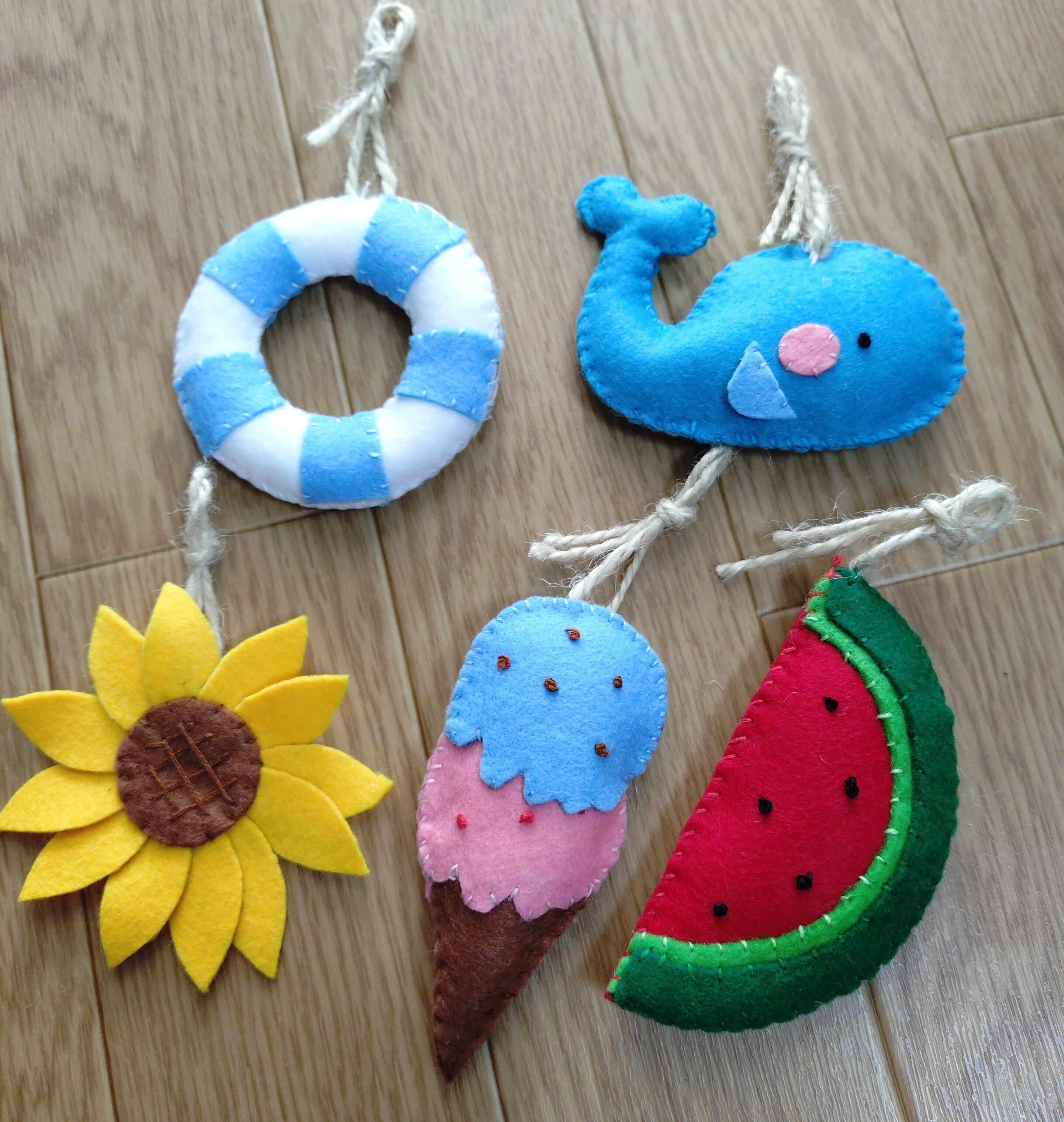 中に綿を入れ、ふんわりフエルトで作った、かわいらしいフエルトオーナメントです