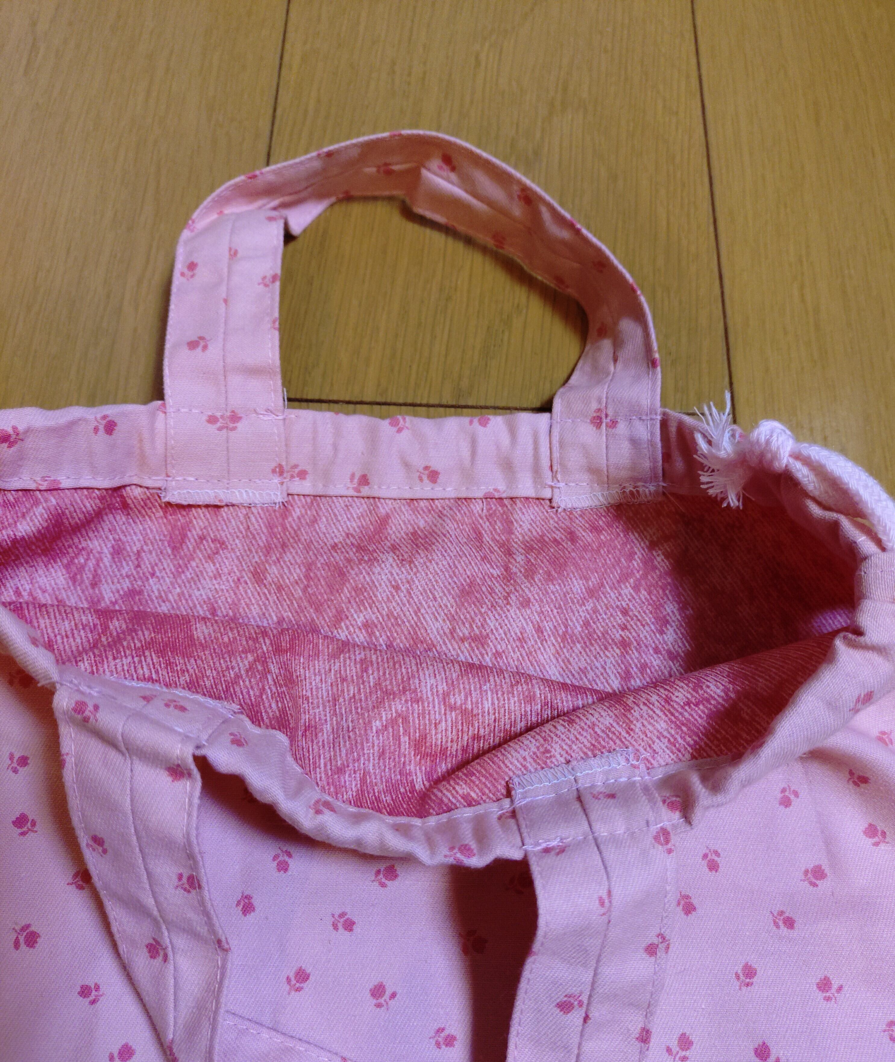持ち手は共布でしっかりと作られており、持ち運びも便利です。