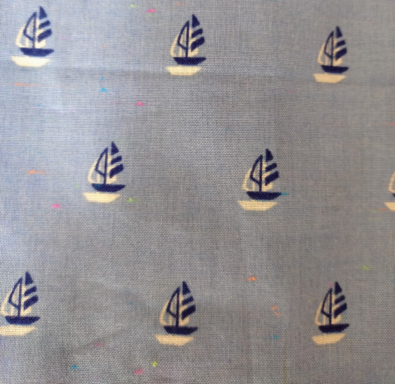 爽やかなブルーの生地に小さなヨット柄が散りばめられ、マリンテイストたっぷりの一枚