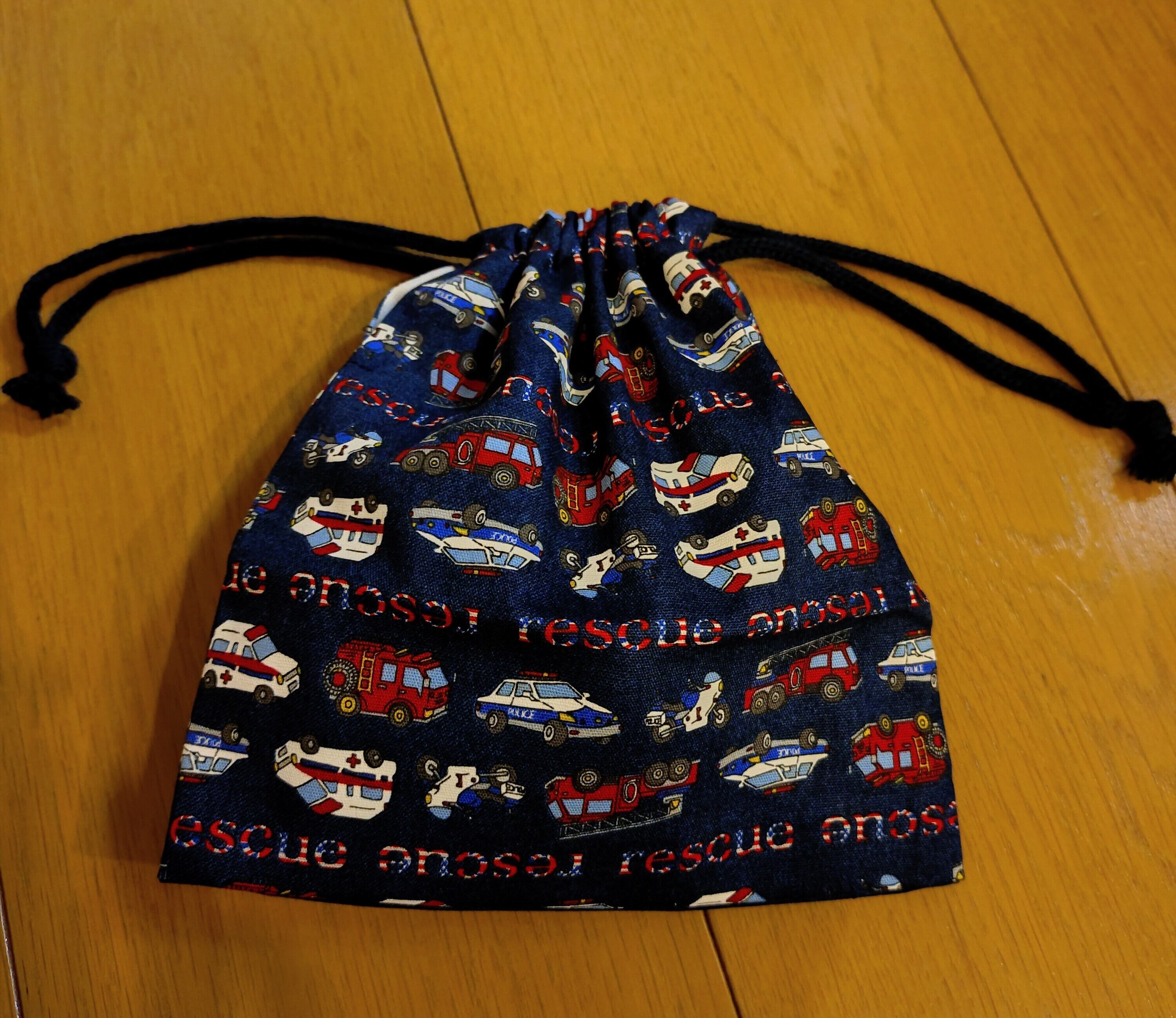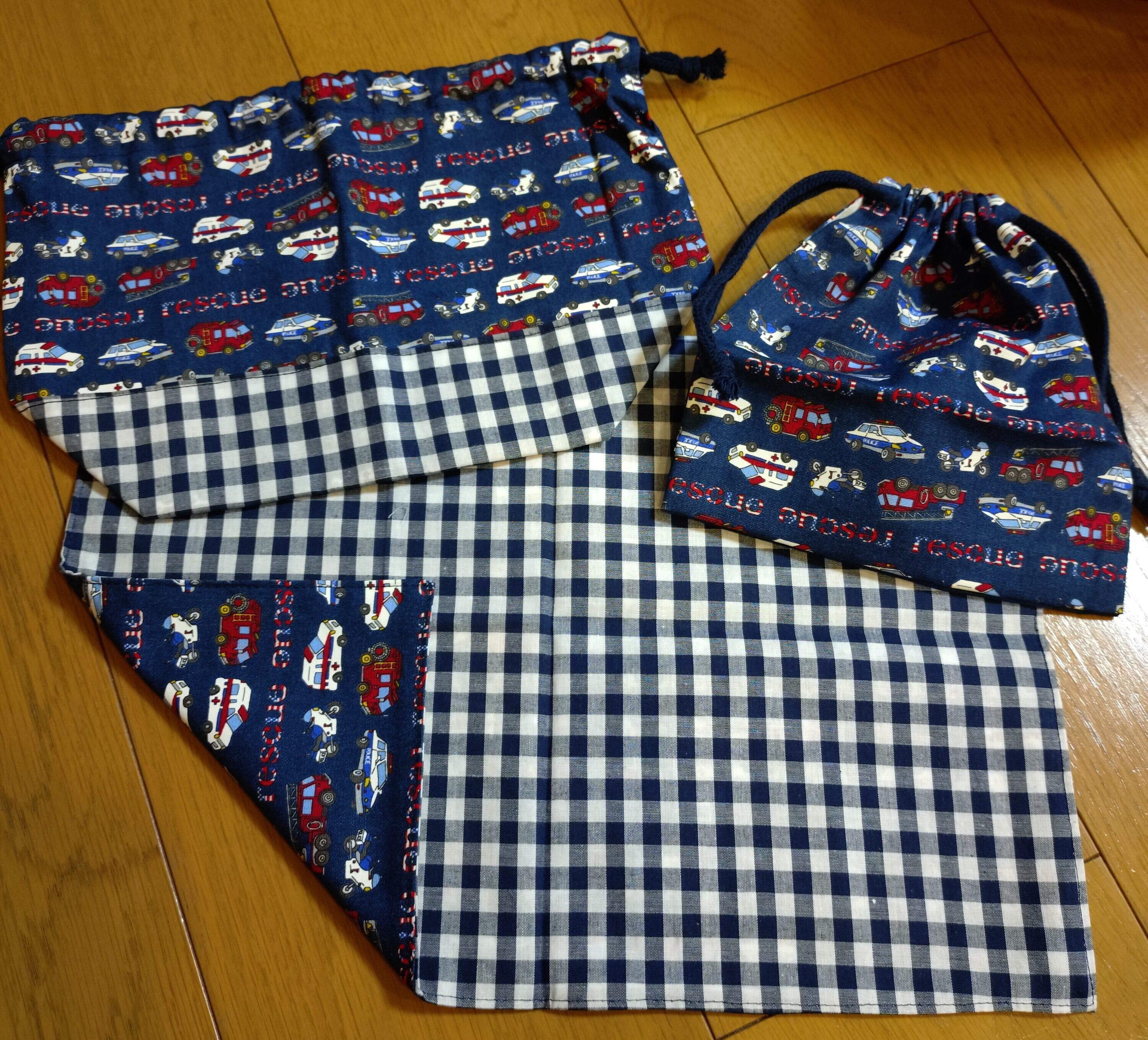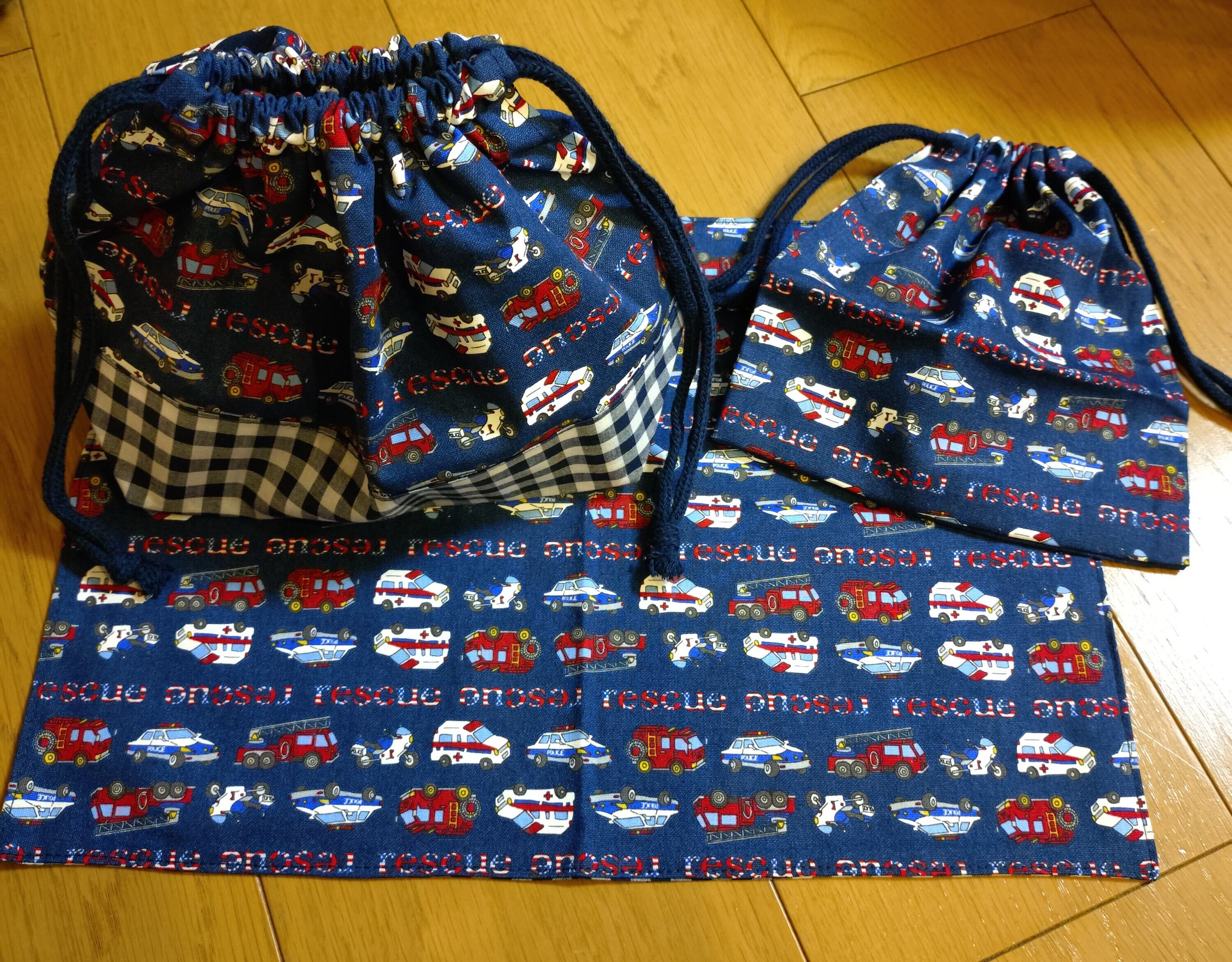 ハンドメイドのお弁当袋、コップ袋、ランチョンマットの3点セットです。