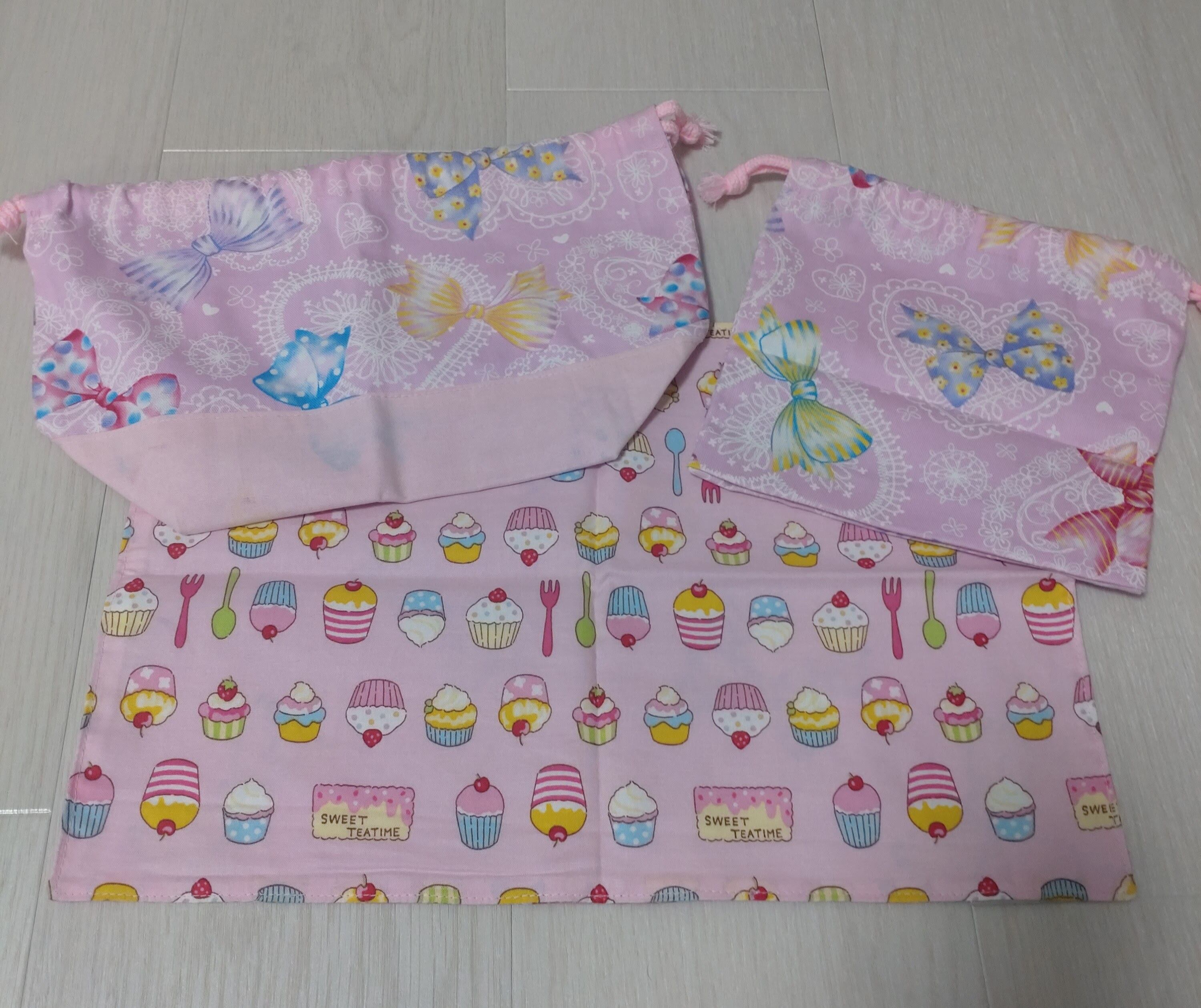 ハンドメイドのお弁当袋、コップ袋、ランチョンマットの3点セットです。