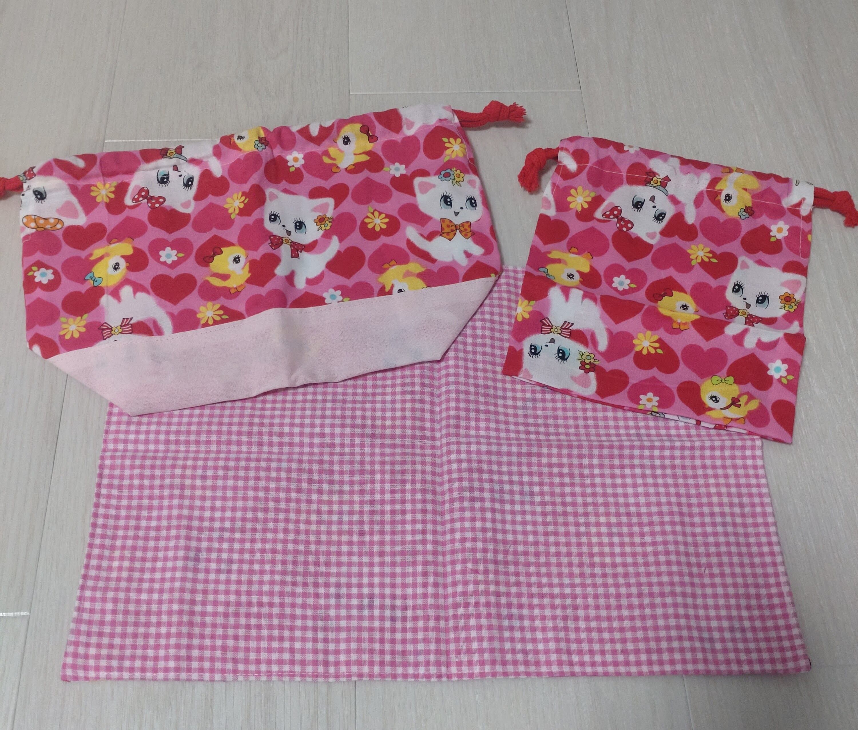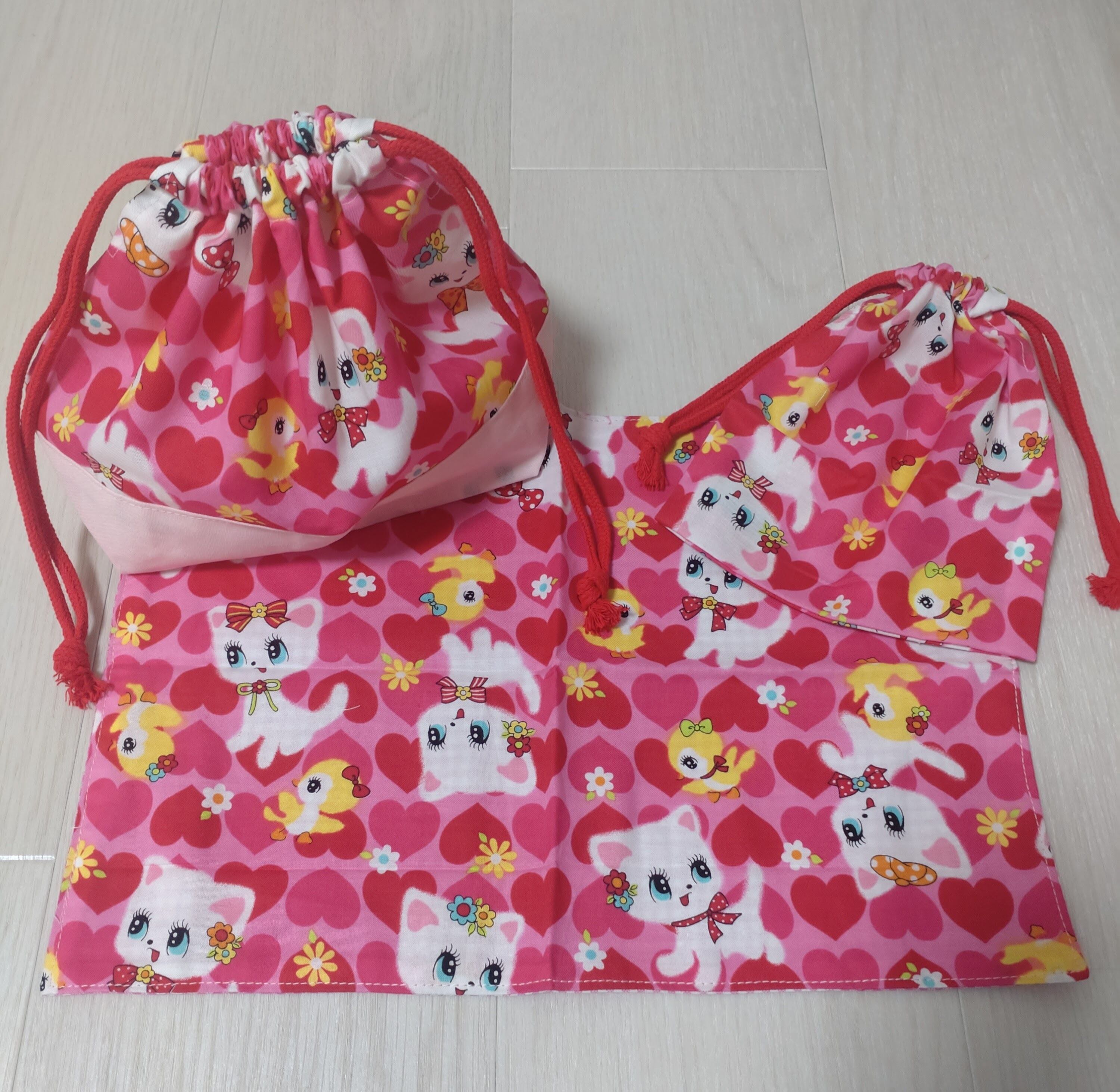 ハンドメイドのお弁当袋、コップ袋、ランチョンマットの3点セットです。