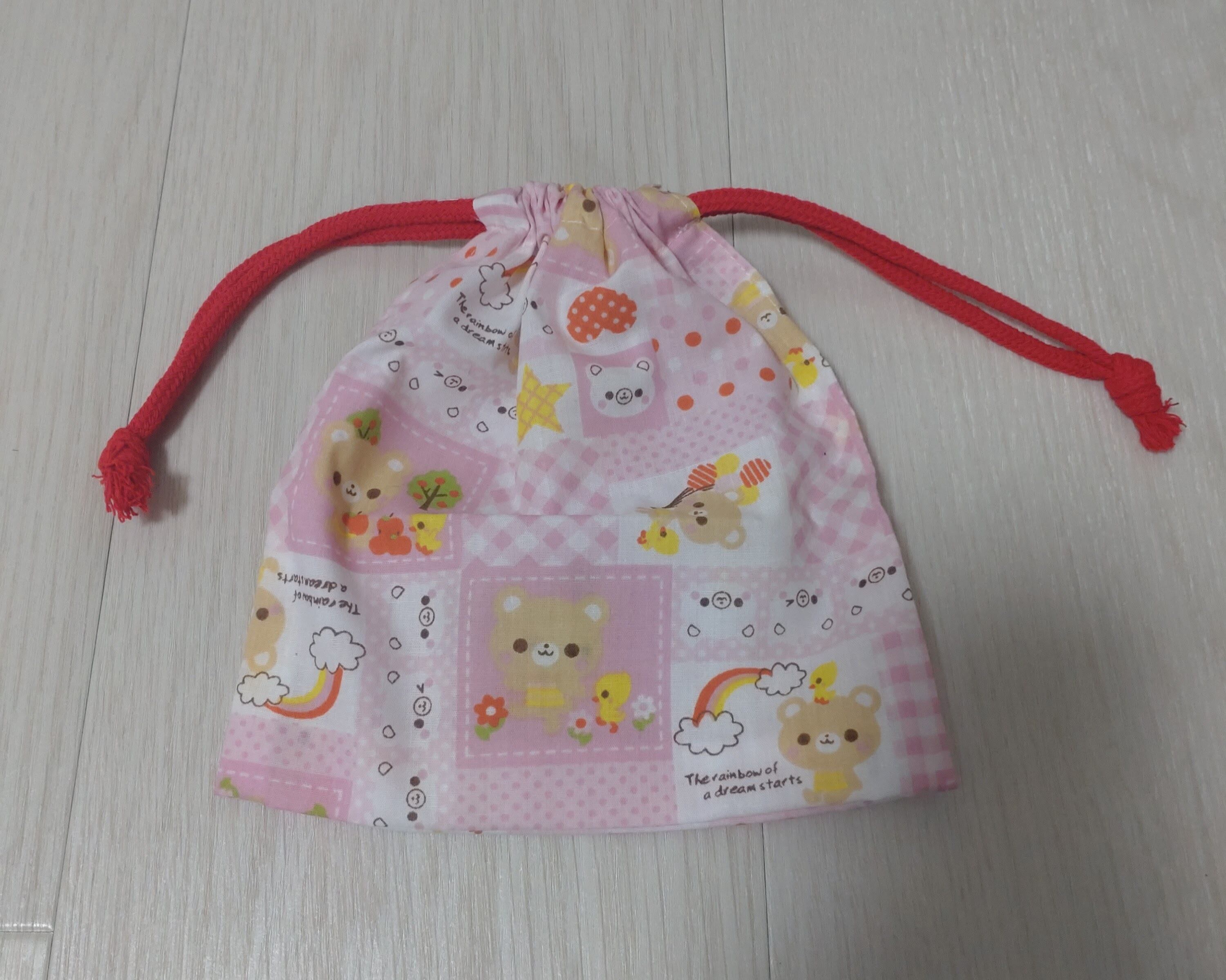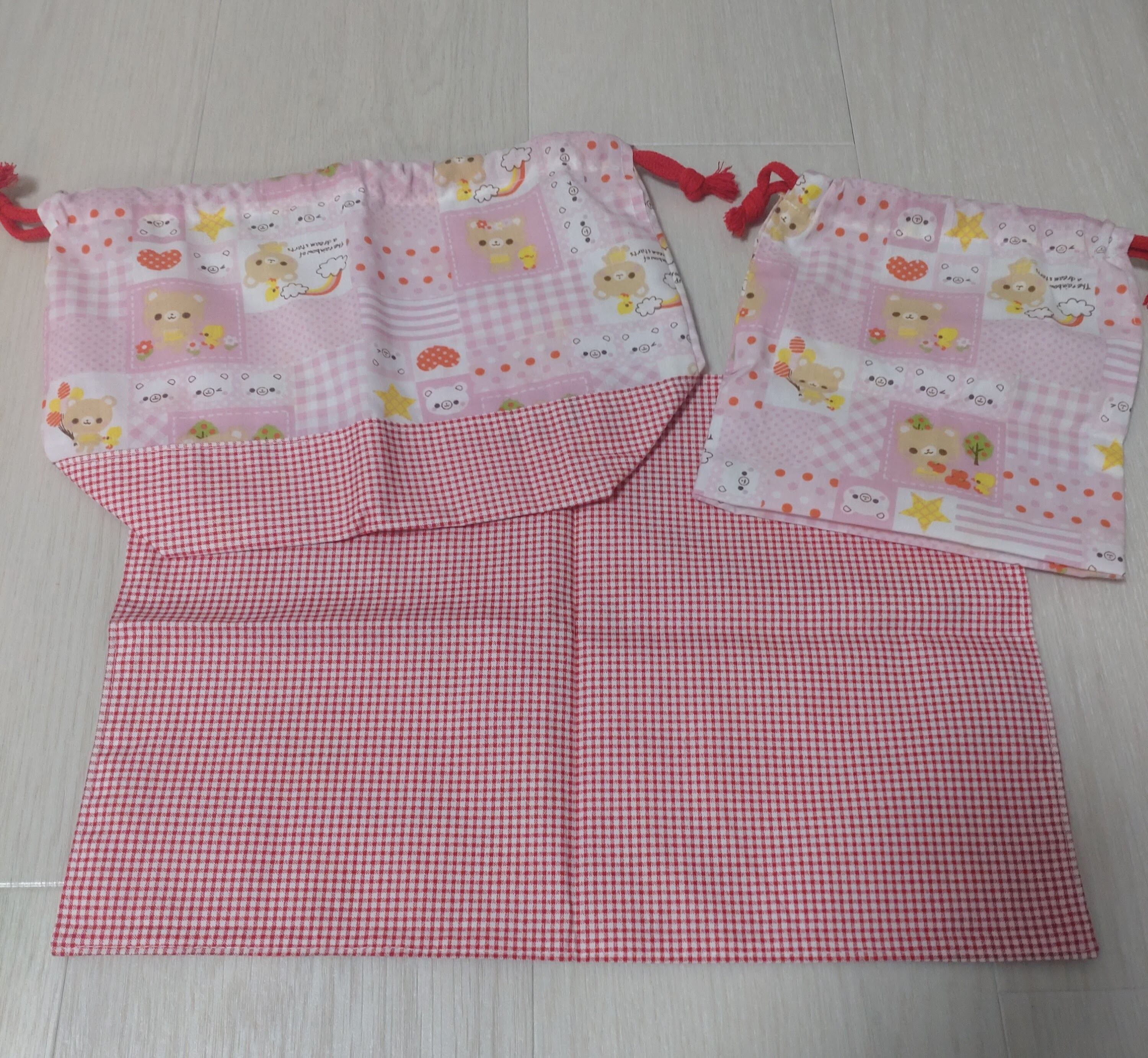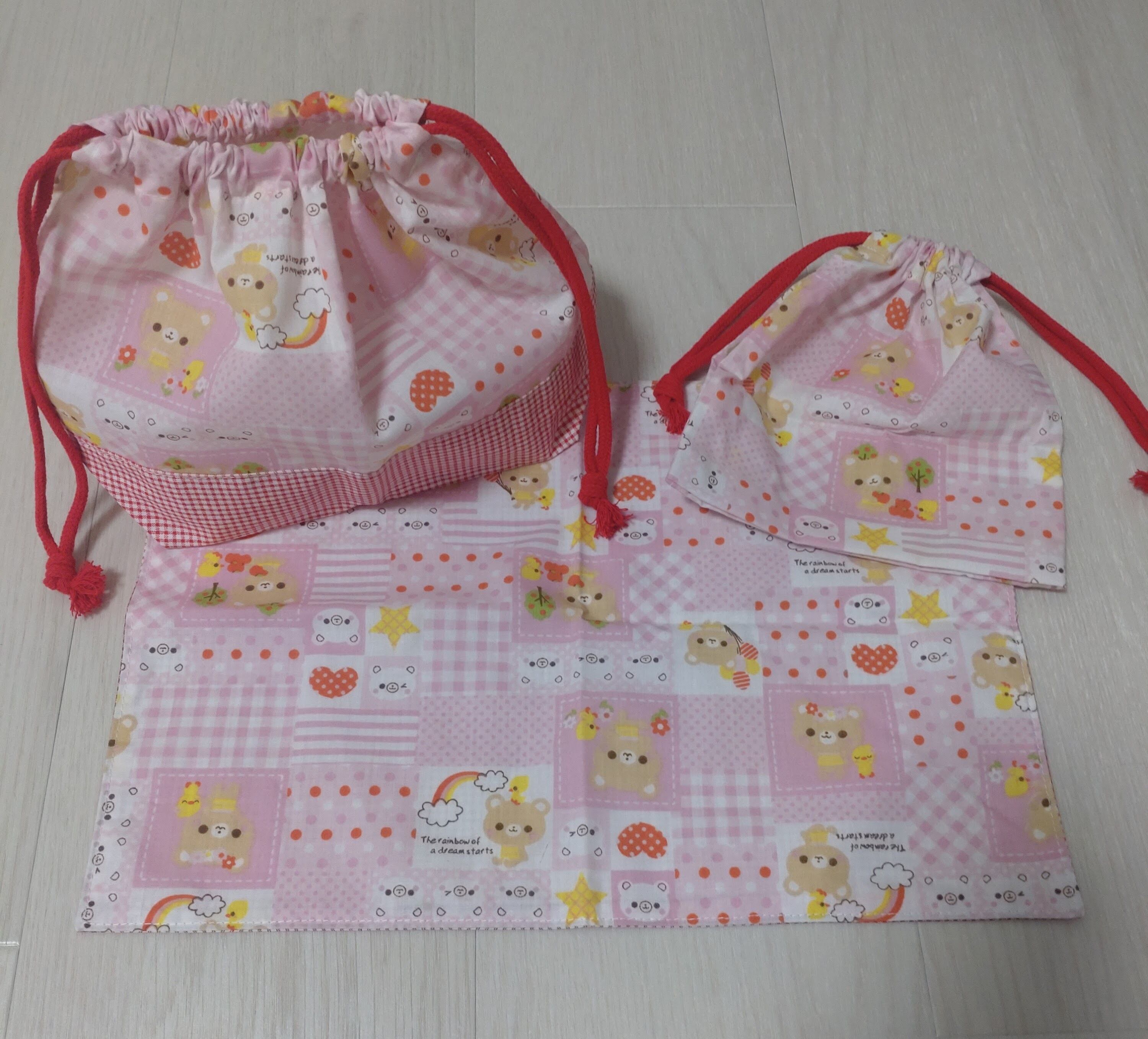 ハンドメイドのお弁当袋、コップ袋、ランチョンマットの3点セットです。
